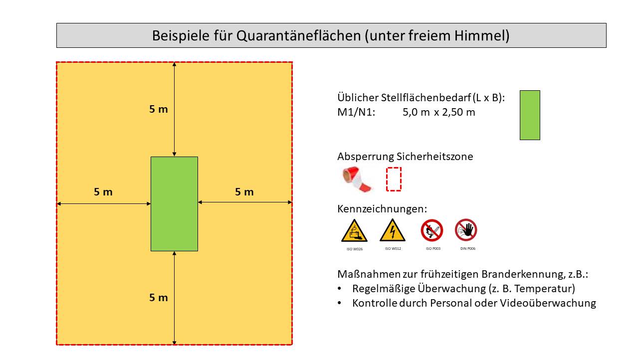 Die Verbände VDA und VDIK haben dazu mit dem Dokument „Technische Quarantäneflächen für beschädigte Fahrzeuge mit Lithium-Ionen-Batterien“ (Stand August 2022) klare Empfehlungen veröffentlicht . Darin wird beschrieben, wie eine sogenannte Technische Quarantänefläche auszusehen hat und welche Rahmenbedingungen zu beachten sind.