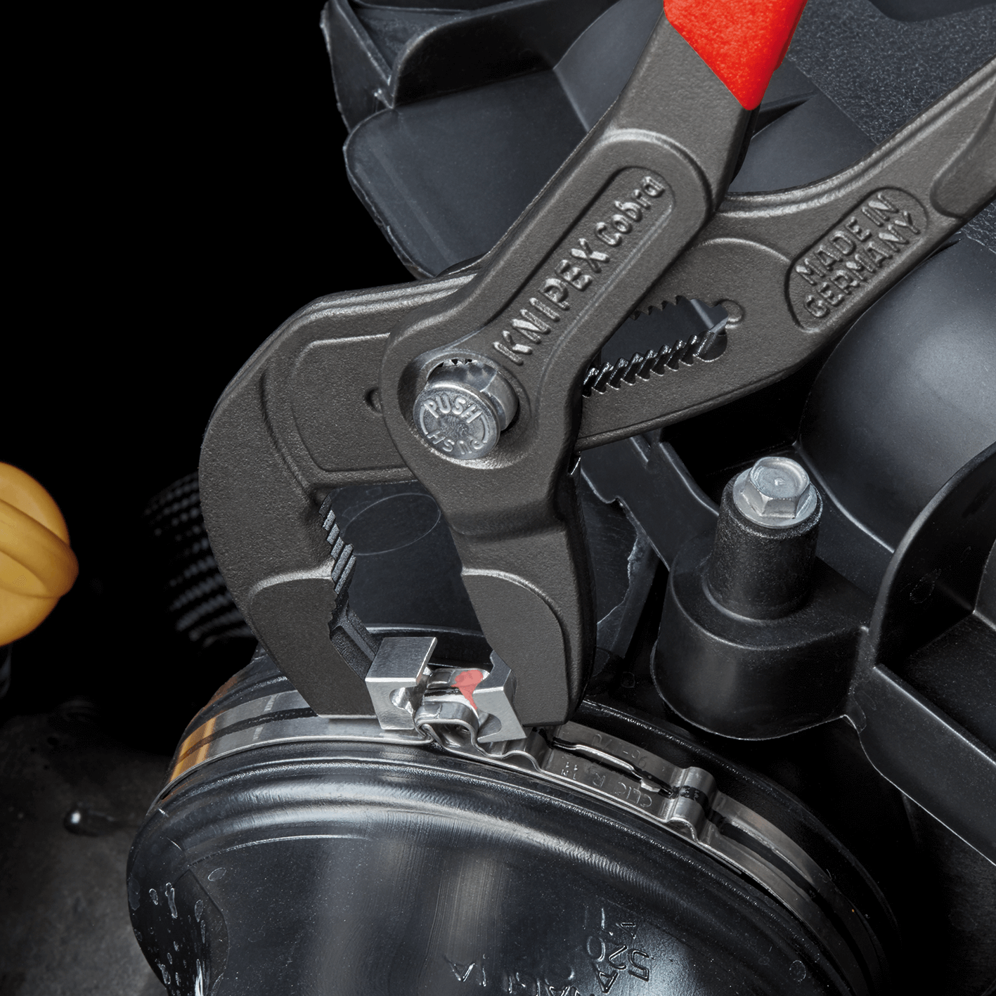 Schlauchschellenzange für Click-Schellen. Universell, zum Öffnen & Schließen von Click-Schellen, mit & ohne Anschlag. Lageunabhängige Verwendung durch, unter Belastung, drehbare Greifeinsätze. Quick-Set-Verstellung für bedienerfreundliche Einhandbedienung: Einstellung direkt am Werkstück, mit Feststeller und Feinverstellung. Klemmschutz verhindert Quetschverletzungen, kraftsparend durch extrem gutes Übersetzungsverhältnis (5:1), schlanke Bauform & abgewinkelte Backen: Ideal für beengte Platzverhältnisse, Chrom-Vanadium-Stahl, geschmiedet. Mit rutschfesten Kunststoffgriffhüllen, Länge 250 mm.