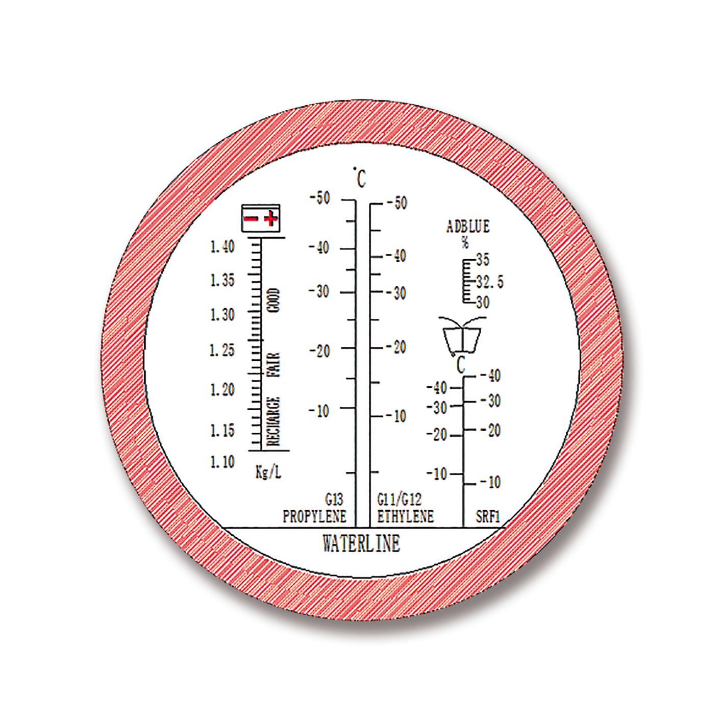 Prüfgerät f. Frostschutz Batteriesäure + Waschanlage. REFRAKTOMETER, Kunststoffausführung zur Prüfung von: Kühlmittel: von 0 bis -50 °C, Batterie: von 1,1 bis 1,4 kg/l, Scheibenreiniger: von 0 bis -40 °C, AdBlue-Skala: 30 bis 35 %.