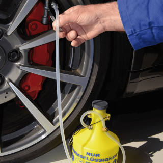 Der Entnahmebehälter für einen schnellen Flüssigkeitswechsel ist mit einem integrierten Rückschlagventil ausgestattet, was ein Auslaufen der im Schlauch befindlichen Bremsflüssigkeit verhindert. Der angeschlossene Silikonschlauch gewährleistet zudem dauerhafte Elastizität und Transparenz.