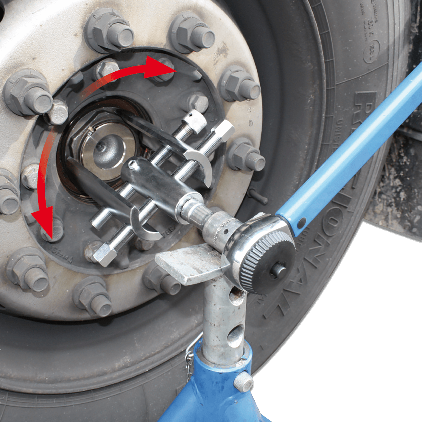 Vario-Muttern- und Kappenschlüssel-Satz, 13-teilig. Das Problem: Viele Werkstätten stehen im Zuge einer Reparatur plötzlich vor einer Verschraubung (z.B. LKW Fettkappe / Achsmutter etc.) mit einem nicht gängigen Antrieb. Ebenso kann eine abnormale Schlüsseldimension (z.B. SW 120) zum Problem werden. Die Lösung: Mit dem neuen Vario-Muttern- und Kappenschlüssel lassen sich die meisten dieser Spezialmuttern und Kappen sicher De- und Montieren. Vorteile: - Kostensparend - da Wegfall des Kaufs einer Vielzahl von Spezialschlüssel, - Werkstatt kann in kürzester Zeit auf die neue Aufgabenstellung reagieren, - Kein Zeitverlust durch den aufwendigen Bau eines Provisoriums bzw. die Fahrt zur befreundeten Werkstatt, um ein Werkzeug zu leihen, - Über 3/4" Antriebsvierkant drehmomentgenauer Anzug möglich, - Sicherer Halt durch Spannschrauben und Adapterführung am Grundgerät, - Schlanke Bauform - dadurch sehr gute Erreichbarkeit der Verschraubung etc., Einsatzbereiche: 6-kant-Muttern / Kappen 8-kant-Muttern / Kappen Nutmuttern Rundmuttern (mit Zweiloch- und Kreuzlochantrieb) Arbeitsbereich: 6-kant - 49-135 mm - (1-3/4" - 5-3/4") 8-kant - 49-143 mm - (1-3/4" - 5-5/8") Nut- bzw. Bohrungsabstand max. 145 mm Gewicht: 2830 g Gesamtlänge: 180 mm Antrieb: 3/4" Innen-Vierkant Bestehend aus: 1 x Grundgerät mit Fixiereinrichtung, 3 x Aufnahme-Adapterpaar, rund, Ø 6 / 8 / 10 mm 3 x Aufnahme-Adapterpaar, 4-kant, 6 / 8 / 10 mm.
